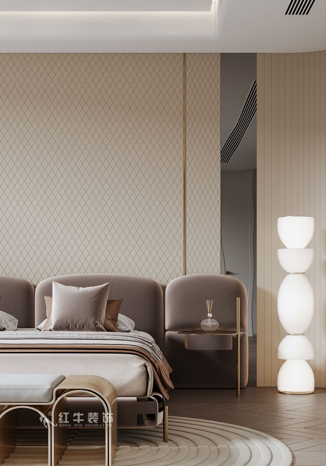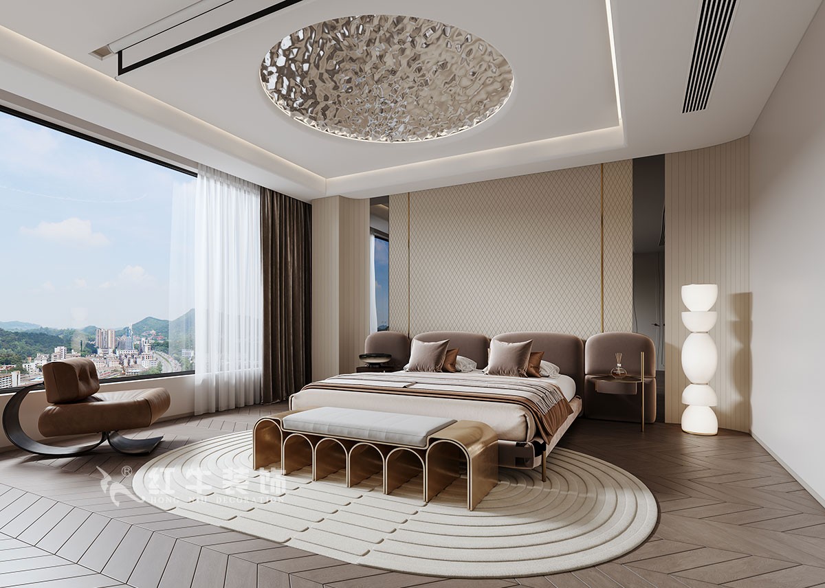 主臥的設計上,用簡單的屏風設計分割出衣帽間,休閑區等功能分區,但是在視覺上并不會顯得擁擠。整體的吊頂進行改動,增加設計風格的體現,無主燈的設計滿足各個空間的照明需求,也讓空間更加簡潔明亮。