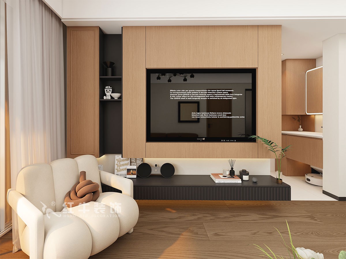 客廳說明:客廳空間墻面大面積留白,柔和的色彩,搭配電視背景墻,也為空間注入了層次與韻味。