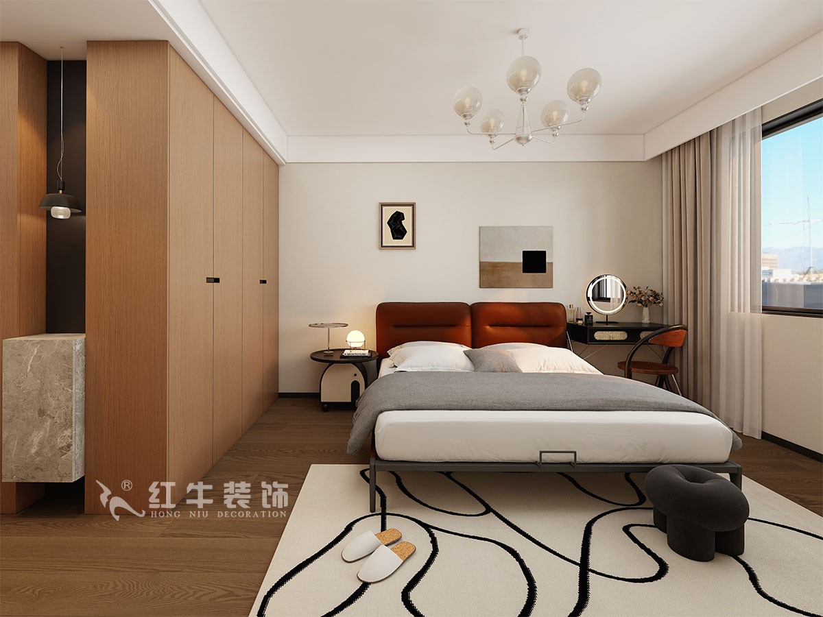 臥室說明:搭配大面積的木色定制衣柜,床頭的光源以不同形勢呈現,既滿足不同燈光需求,又恰到好處地起到了裝飾效果,使整體臥室空間呈現明亮、溫柔的舒適狀態。