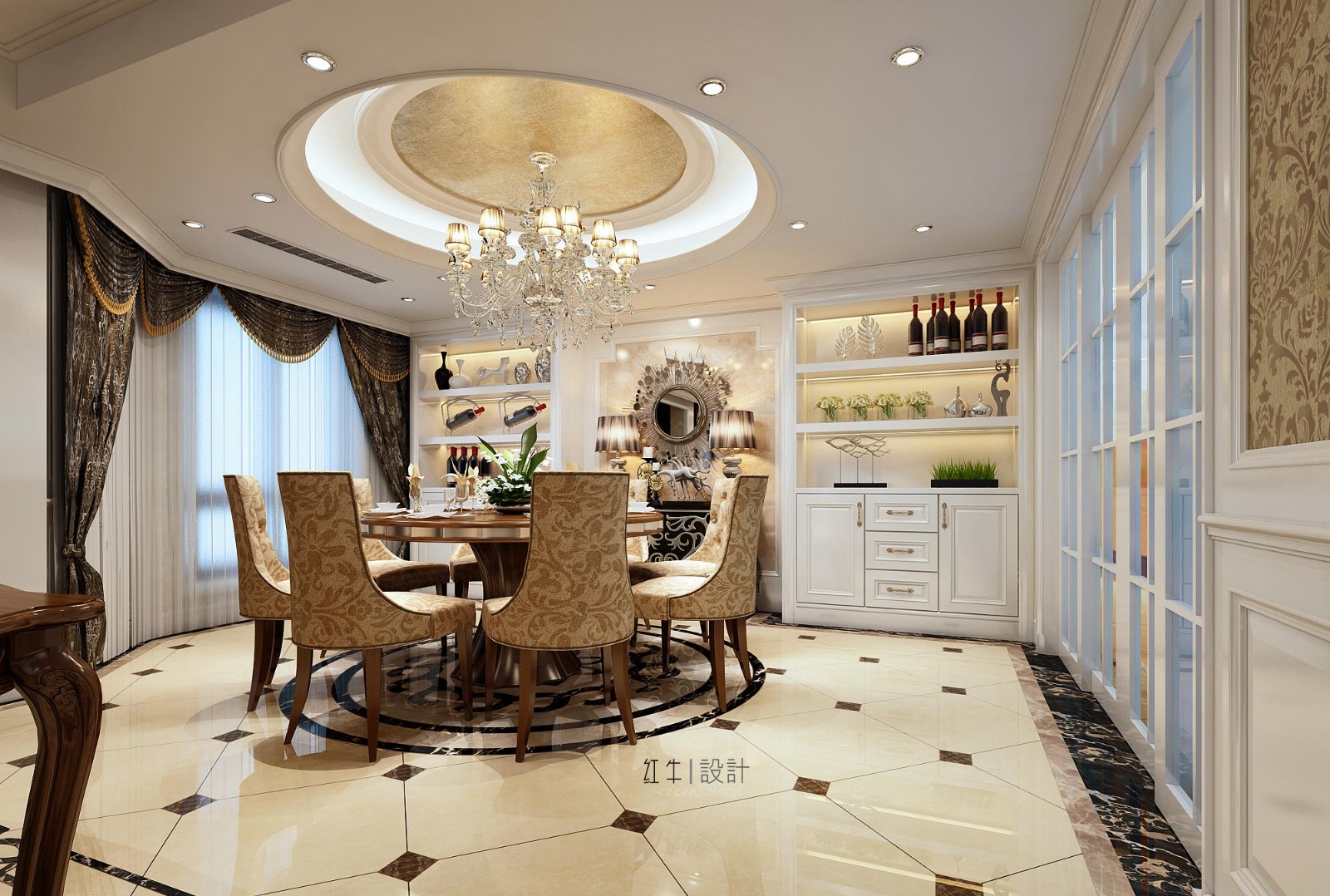 簡約歐式風格沿襲古典歐式主精華,融入現代生活元素,歐式風格有的不只是豪華大氣,更多的是愜意和浪漫。通過完美的點線,精益求精的細節處理,帶給家人不盡的舒適觸感.本案中,設計師大膽使用了深色系的軟裝搭配,點綴以棕色的硬裝家具的呼應,再融合華麗的線條以及地面拼花,正迎合了歐式風格強調以華麗的裝飾,濃烈的色彩,精美的造型打到雍容華貴的效果。餐廳的金箔頂面和電視背景墻的暖色大花墻紙,更從新古典的尊貴感上為空間增色不少。