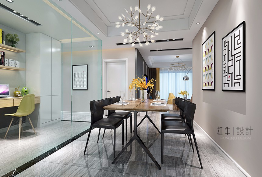 上文也說到了,設計師將原廚房改成了書房,書房用玻璃隔斷,增加了整個空間的視覺感。