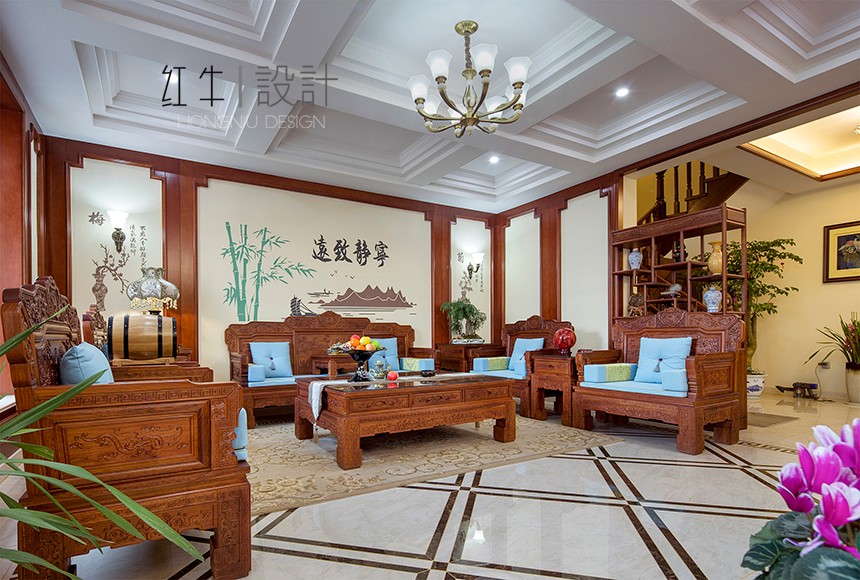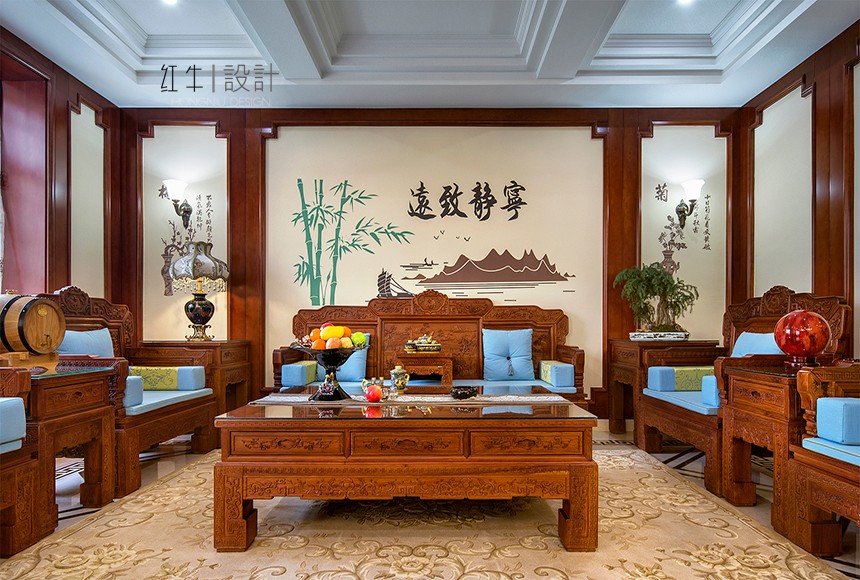 本案以傳統古典文化為背景,通過紅木工藝品、青花瓷、紫砂壺等,營造出極富中國浪漫情調的生活空間。