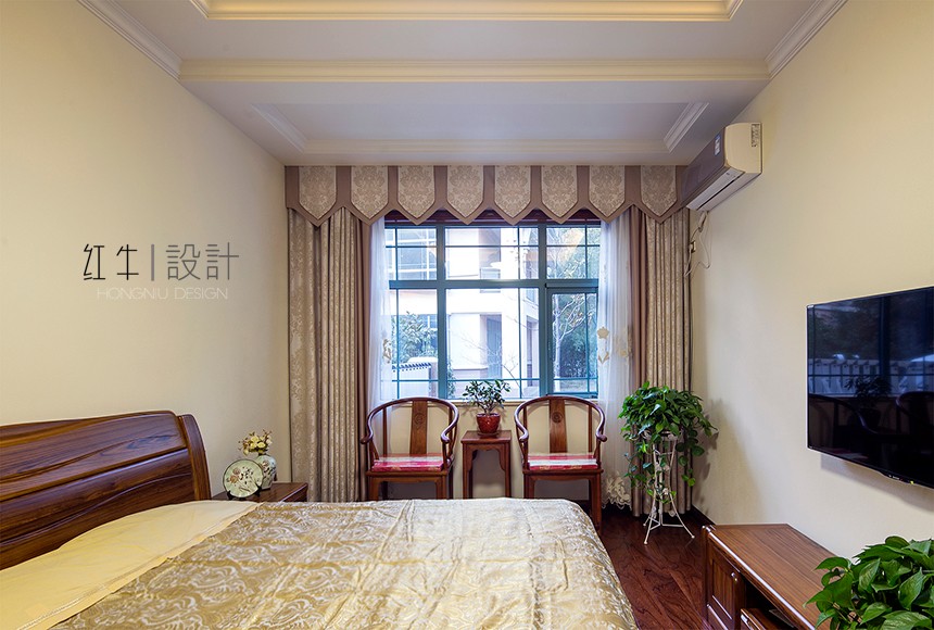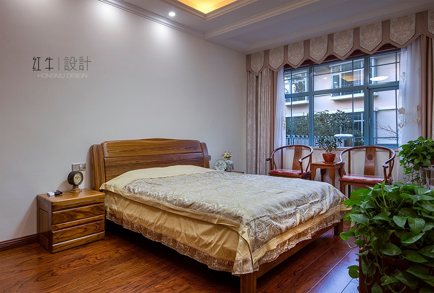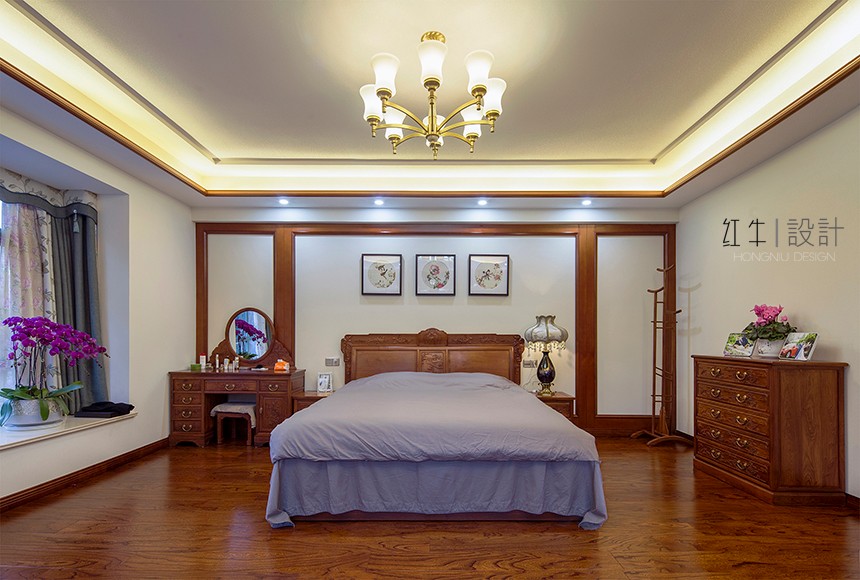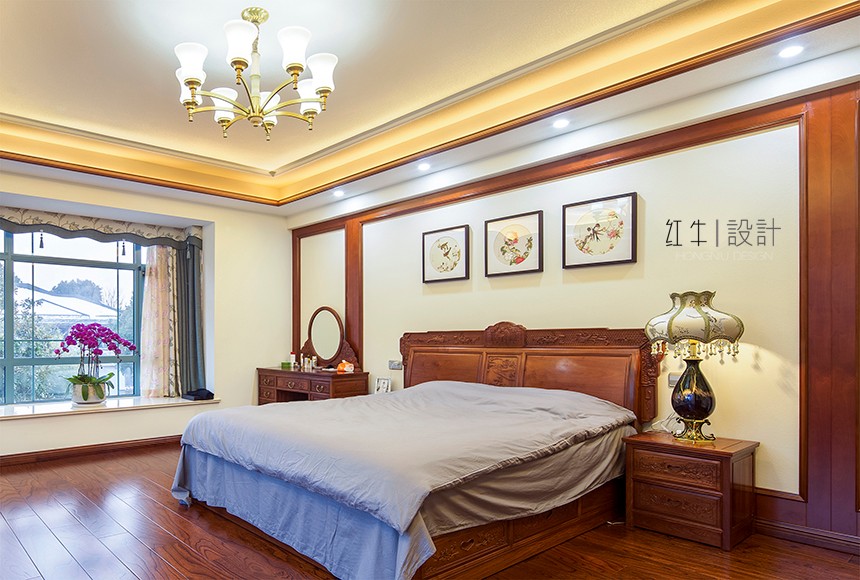臥室在色彩方面秉承了傳統古典風格的典雅和華貴,但與之不同的也加入了現代元素。在配飾方面更為簡潔,少了許多奢華的裝飾,更加流暢的表達出傳統文化中的精髓。精巧的燈具和雅致背景,使整個臥室在濃濃的古韻中透著現代氣息。