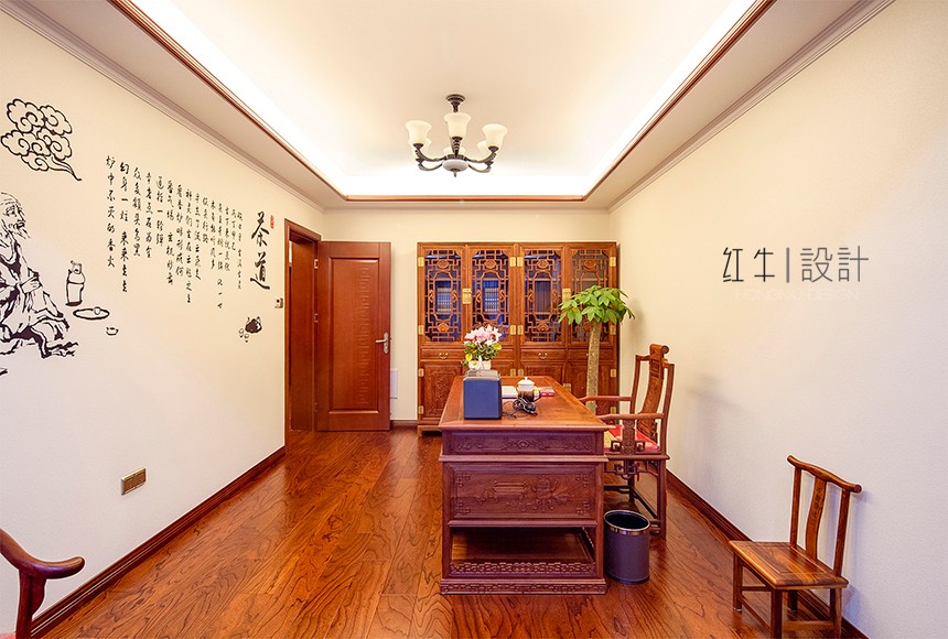 一個茶香墨韻的中式書房,在莊重典雅的氛圍中流露出深厚的文化底蘊。