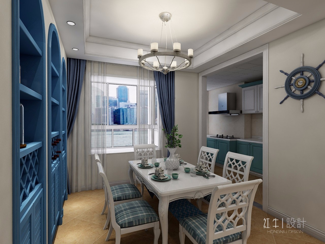以白色為主色調的餐廳,顯得尤為純凈雅致,最吸睛的就是藍色的內嵌的置物架,頂部的拱形設計就是地中海風格的典型特征。