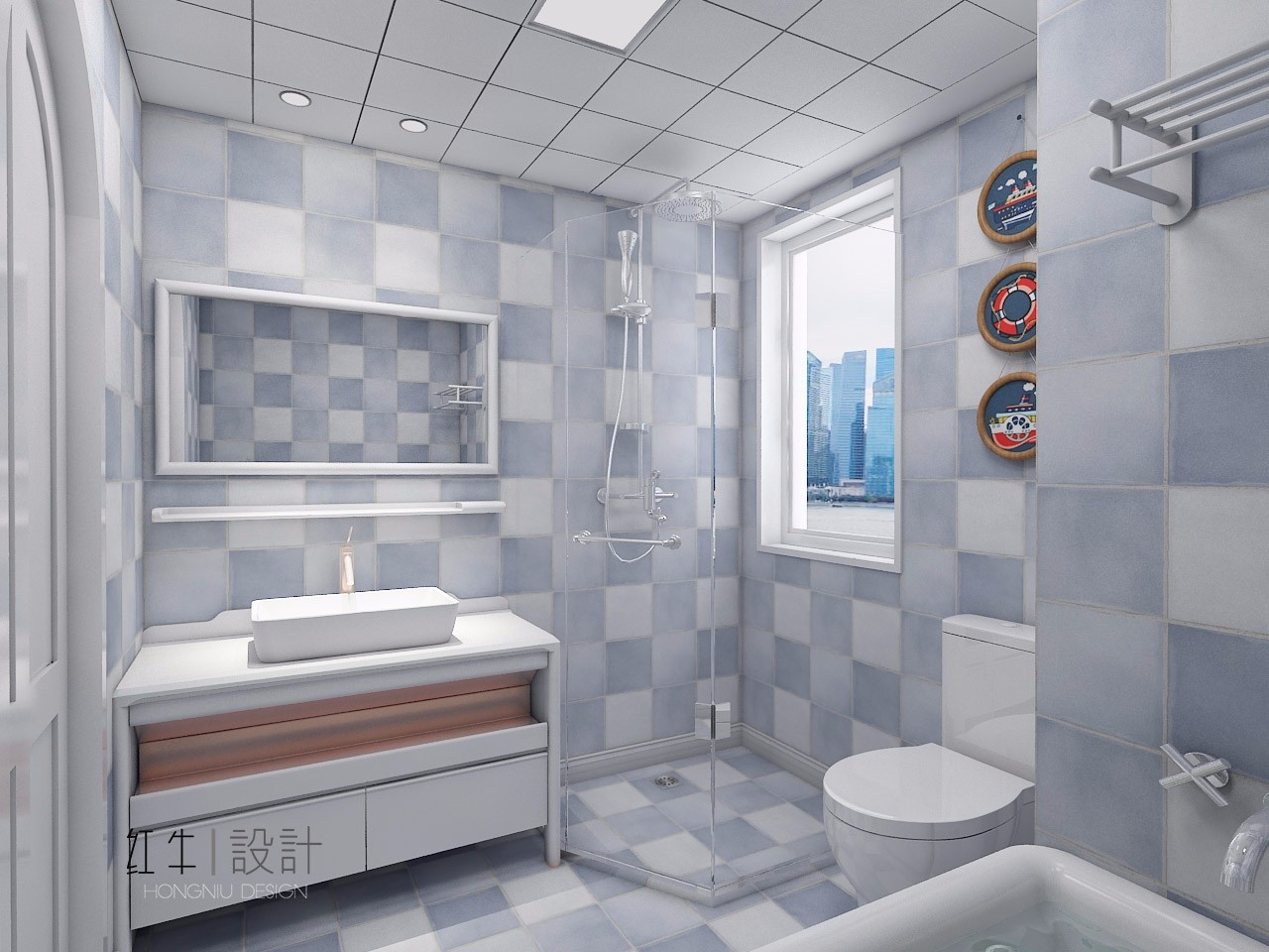這是主臥的衛生間,不同的藍色、白色瓷磚拼貼在一起,在井然有序中又體現出生動和變化,看著感覺心情舒暢。