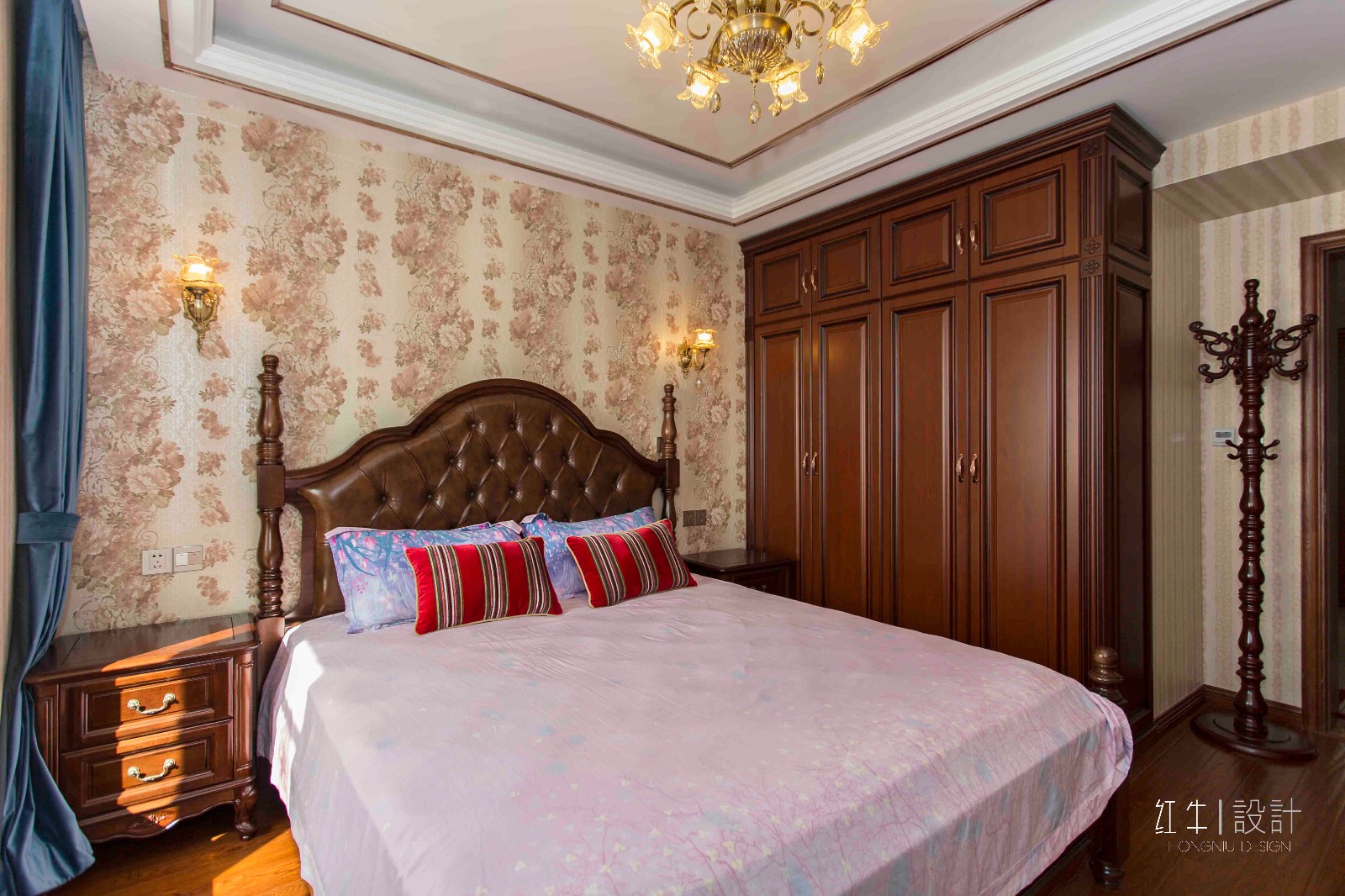 主臥深色地板和整個的裝修格調完美搭配,自有一種沉穩大氣。床是柱式床,為美式床類產品的主流之一,穩重華貴而又富有浪漫氣息,是一種很流行的經典款式。衣柜也是美式風格,大氣簡單,十分實用。
