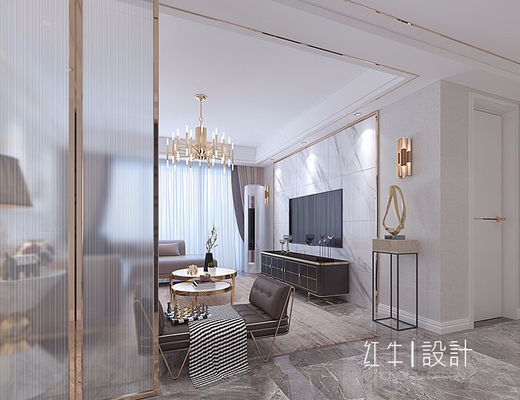電視背景墻設(shè)計(jì)撇去繁復(fù),靈透的大理石,隱約顯露著光澤金屬線條,兩邊的墻紙緩和了理石的剛硬,氛圍輕松優(yōu)雅,品質(zhì)延續(xù)之余,恰到好處的平衡了空間的剛?cè)峒±怼?