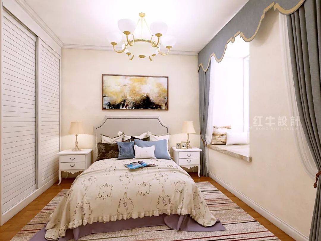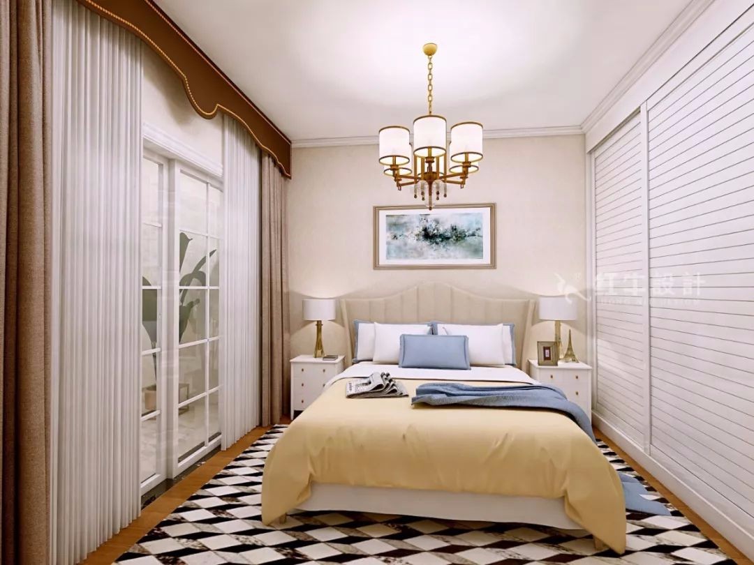次臥的色彩典雅溫暖,略帶歐式風格的床頭柜,搭配精美的床頭掛畫,讓人產生愉悅的視覺感受。