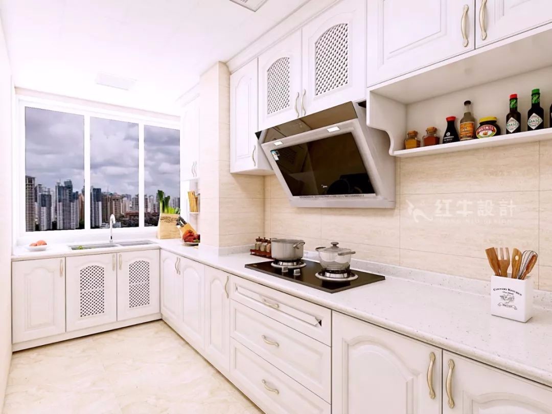 廚房雖然整體呈現出來的都是白色,但卻并不單調,反而很大程度上體現了簡歐風格的特色。
