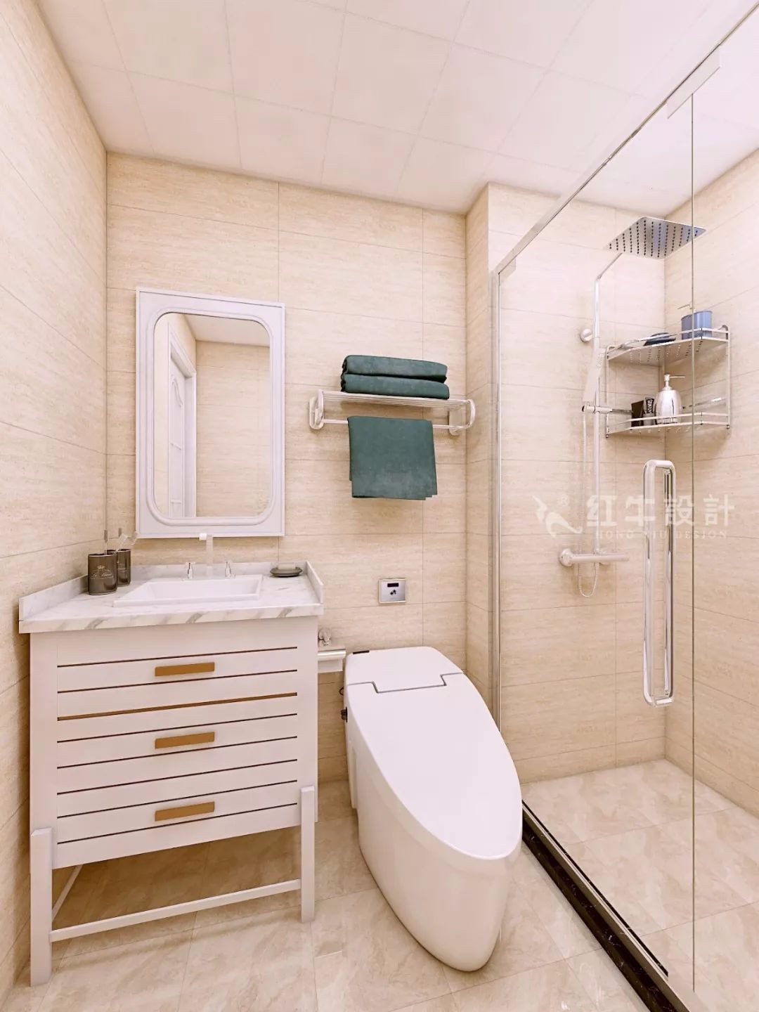 衛生間采用柔和的色彩作為主色調,搭配略帶歐式風情的柜子和梳妝鏡,給人一種干凈而又溫馨的整體感受。