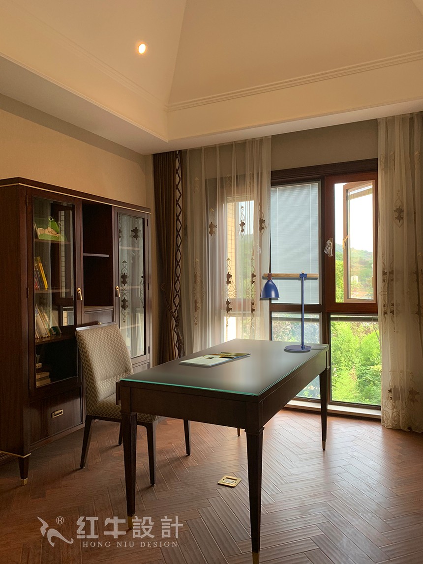 書房空間寬闊,家具樣式簡潔,物品適量,使書房倍顯大氣。玻璃書柜貴氣有質感,還可以防塵保護書籍。雙層窗簾的搭配能夠營造出朦朧的美感。