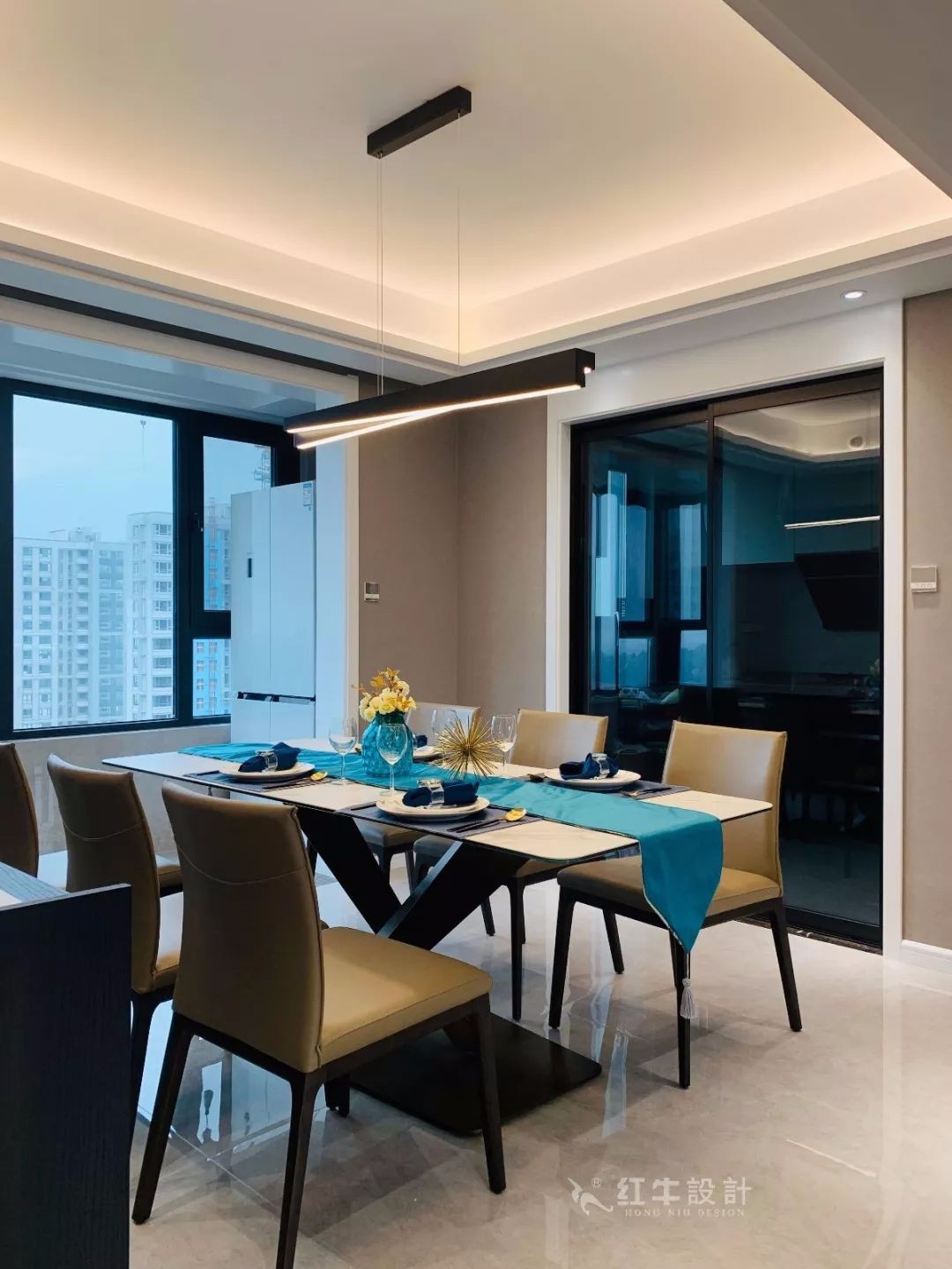 黑白灰的餐桌椅,搭載一盞硬朗造型的吊燈,餐邊柜上擺放了裝飾品,突顯出小資情趣。