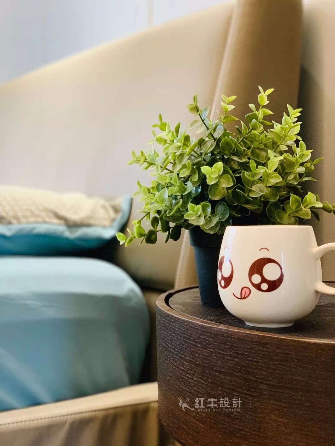 床側擺放圓形床頭柜,上面放著清新的綠植,帶來清新自然的空間氛圍。