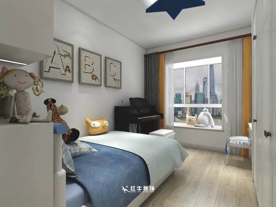 兒童房的設(shè)計很有童趣,各式各樣的卡通玩偶,星星造型的吸頂燈,裝飾畫上的ABC,無不顯示出這一特點。藍(lán)色的床品也讓空間顯得更加活潑自在。