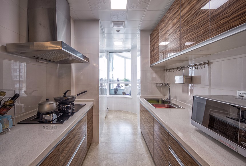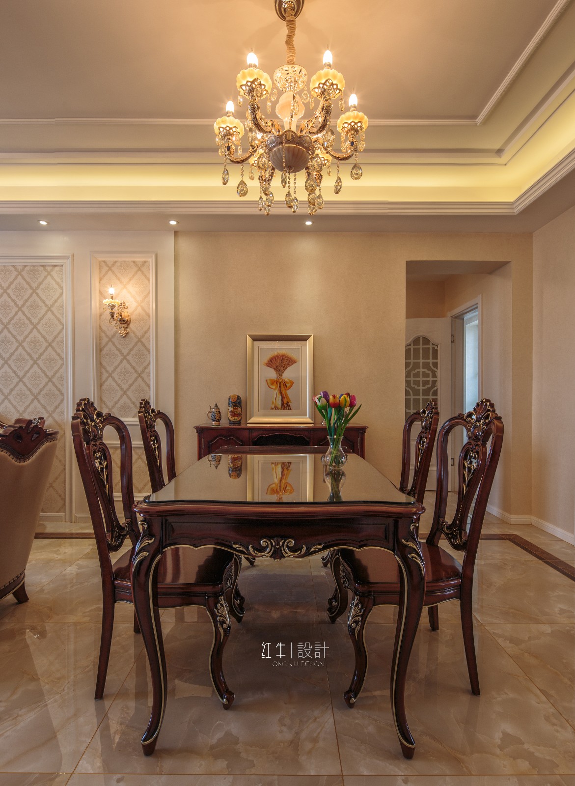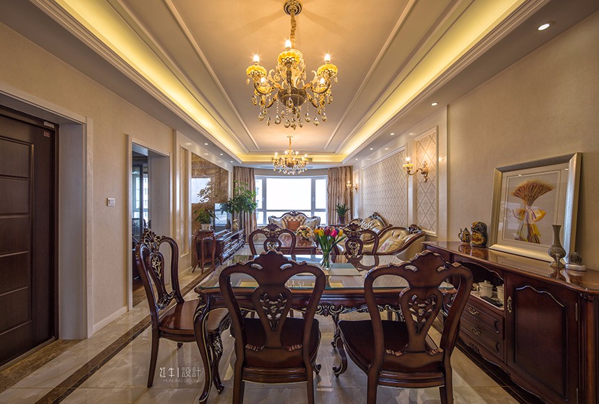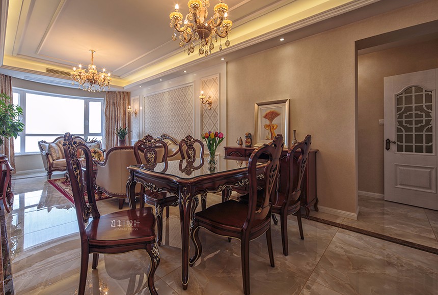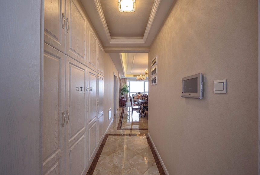 分享和交流是本案的精髓。初次溝通,此案是祖孫三代同住,業主為中年人,經常去歐洲國家出差,對歐洲文化獨有情鐘,所以此案有效的利用空間、并用簡約明快的造型及色彩以突顯空間及功能的延續性,并融合歐式的裝飾元素及裝飾色彩。設計中的造型呼應的技巧,頂面造型和地面材質造型的相互呼應,沙發背景和電視背景造型的相互呼應,門廳造景和餐廳造景的相互呼應,運用多組呼應的設計技巧,像作文章的排比句,把整個空間貫穿起來,使得氛圍更加濃烈,整體性更加統一。打造出一個共享、時尚、典雅的居住空間。