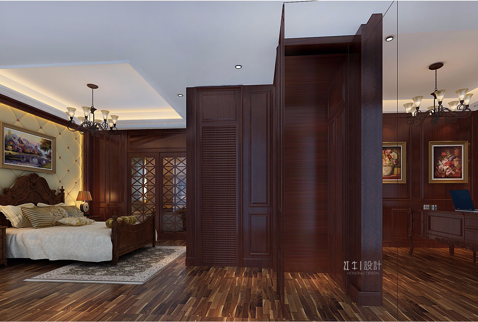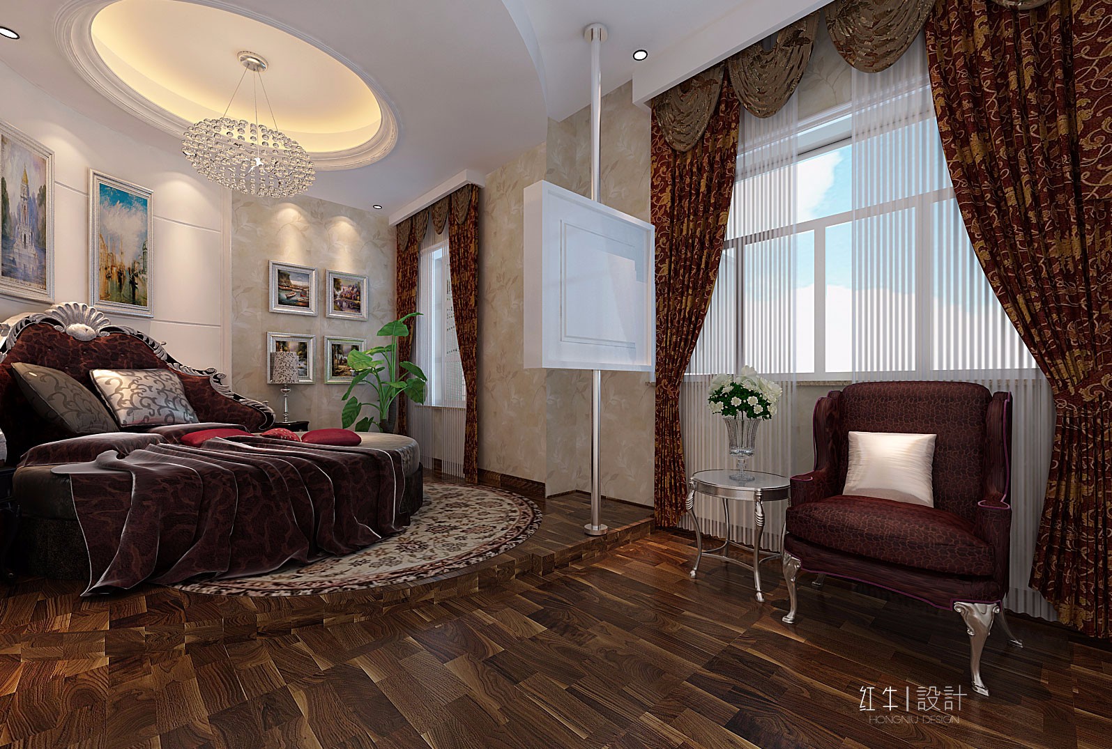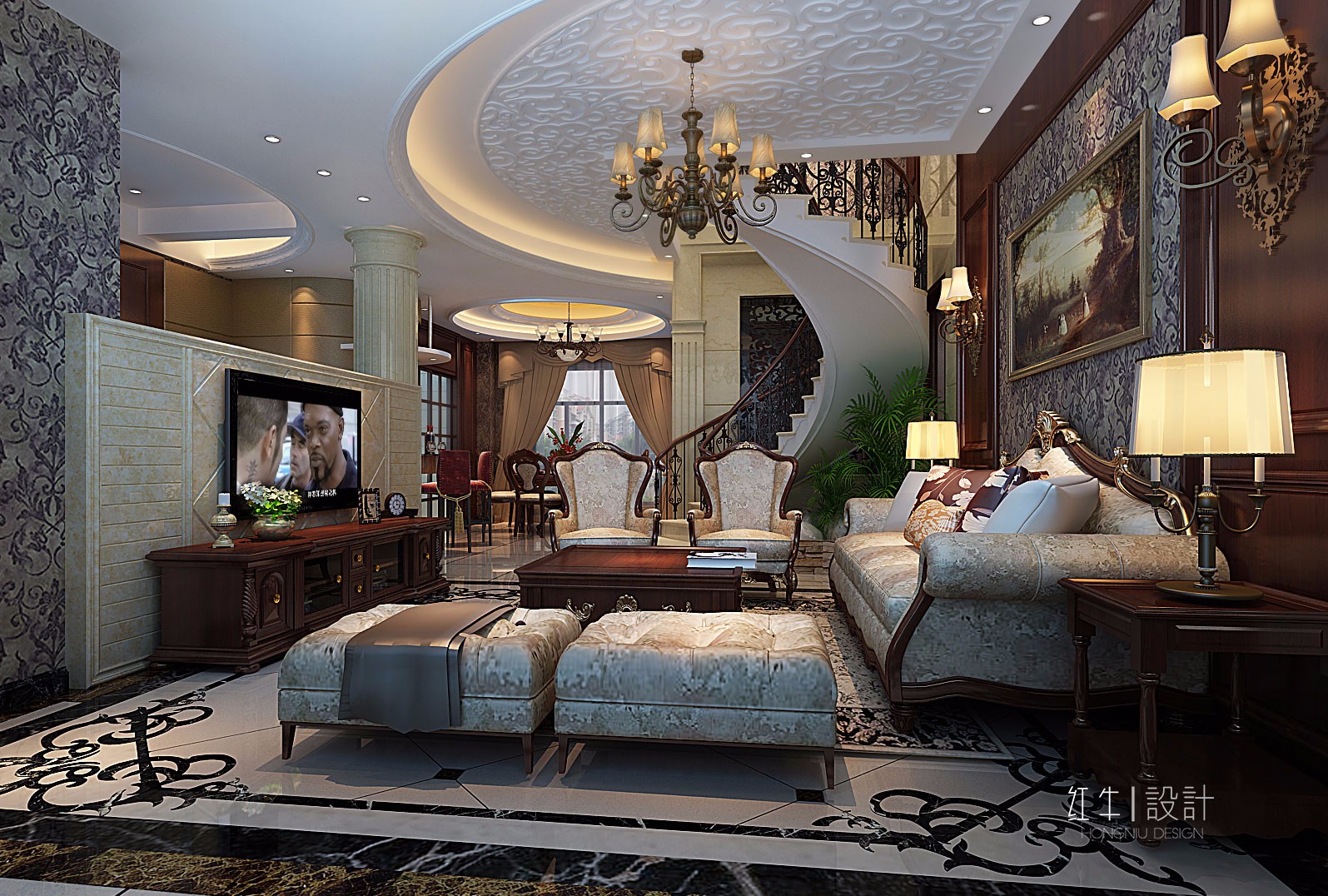 本案強調線形流動的變化,將室內雕刻工藝集中在裝飾和陳設藝術上,色彩華麗且用暖色調加以協(xié)調,變形的直線與曲線相互作用以及貓腳家具與裝飾工藝手段的運用,構成室內華美厚重的氣氛。它在形式上以浪漫主義為基礎,常用大理石、華麗多彩的織物、精美的地毯、多姿曲線的家具,讓室內顯示出豪華、富麗的特點,充滿強烈的動感效果。